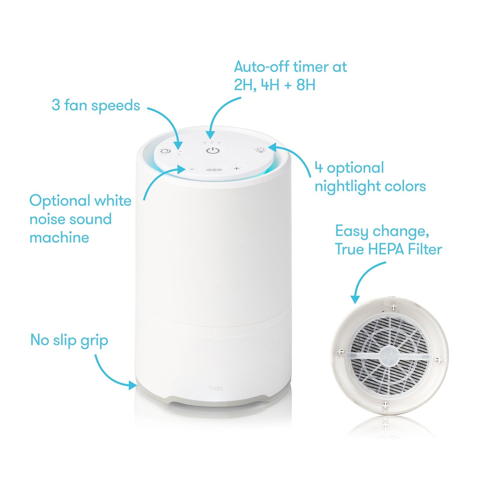 Need to clear the air? Filter out the bad stuff while lulling your little one to sleep with the 3-in-1 Air Purifier + Sound Machine + Nightlight. Remove dust mites, mold spores and air pollution thanks to the easy-change HEPA air filter. Choose from two sleepy sound options, three fan speeds and four nightlight colors to create the perfect ambiance for your kiddo to fall asleep. Simply plug in and breathe easy.